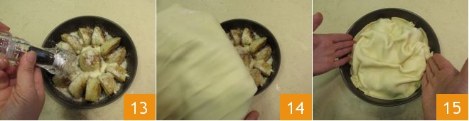 season with salt and pepper 13, then place a round sheet of puff pastry inside, already unrolled 14. Fold the puff pastry inwards to create a border 15.