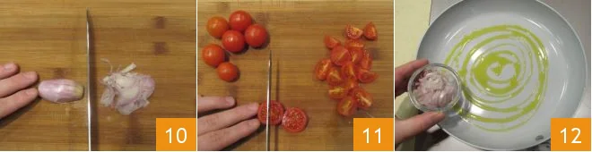 Peel the shallot and chop it finely 10, wash the cherry tomatoes and cut them into wedges 11. Now, in a pan, heat the olive oil, add the chopped shallot 12 and let it soften over low heat for at least 5 minutes. If it dries out too much, add a tablespoon of fish stock or water.