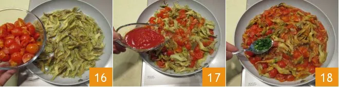 When the shallot is softened 13, add the artichokes drained from the acidulated water 14, add a ladle of vegetable broth 15,