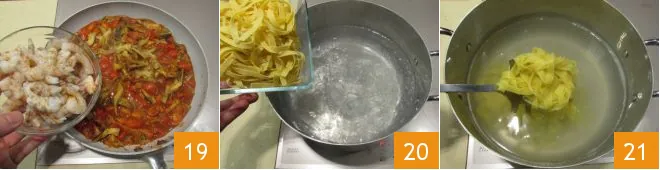 then add the shrimp tails 19, sauté them for 5 minutes, then turn off the heat. Also add the fettuccine to the boiling water and cook them for about 5-6 minutes 20, then drain them 21,