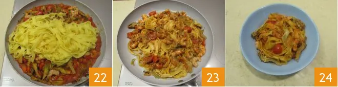 and pour them directly into the pan with the sauce 22. Sauté the fettuccine in the artichoke and shrimp tail sauce 23 to flavor them, and then serve them hot 34.