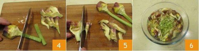 Then remove the outermost part of the stem using a peeler and cut the stem into pieces 4 and the artichoke hearts into slices 5. Keep the artichoke pieces in the acidulated water 6.