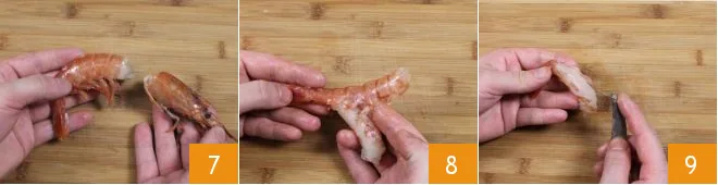 Handle the shrimp: remove the head 7 and shell 8, then gently extract the intestine using a toothpick 9, set the shrimp aside.