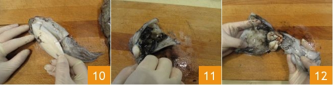 Once the bone is removed 10, try to locate the ink sac and, if present, gently extract it 11, taking it with your fingers but without squeezing it, to avoid breaking it and thus preventing the ink from spilling out. Then separate the head from the body of the cuttlefish 12, holding the latter with one hand and pulling away the tentacle part with the other.