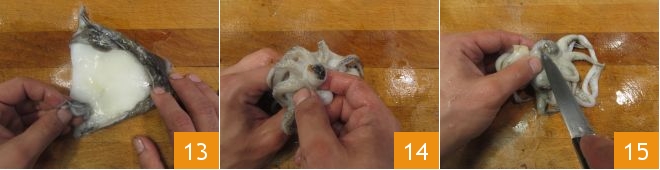 Then remove the small internal appendages 13; peel off the skin by making a small incision and pulling it away with your hands. Remove the beak, or beak, located in the center of the tentacles 14, by pressing with your thumbs underneath the beak to push it upward. Use a small knife to remove the eyes by making a circular incision around the bulb 15, then remove them.