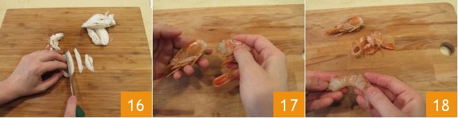 Finally, cut the baby cuttlefish into strips and set them aside 16. Continue with the How to clean shrimp: remove the head 17, the shell 18,