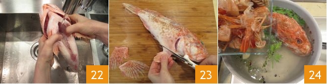 Rinse it well under running water 22, then remove the fins with scissors 23; place it in a large pot along with a clove of garlic, parsley, thyme, and peppercorns, then cover it with water (about 2.5 liters) and let it cook over low heat, along with the scraps from the cleaned fish 34, to obtain a great fish stock.