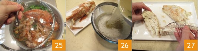 Cover the pot with a lid 25 and let it cook for about 30 minutes. Once cooked, remove the scorpionfish from the water while still intact, let it cool slightly, strain the stock obtained 26, and set it aside. Then debone the fish 27,