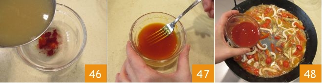 Also dilute the saffron in some stock and fish cooking liquid 46, mix 47 and set aside. Then add the diluted tomato paste 48,