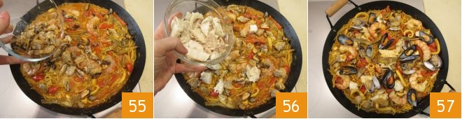 and the clams 55. Finally, add the scorpionfish flesh 56, adjust the salt, pepper, and let the cooking liquids dry out. When the pasta is al dente, turn off the heat and serve your fideuà, garnishing with the whole mussels you set aside! 57.