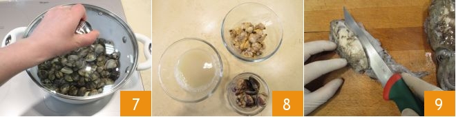 Drain the clams well and place them in a large pot: cover with the lid 7 and turn on the heat: this way the shells will open with the heat. Immediately turn off the heat after they open completely, to avoid overcooking, which can compromise the tenderness of the seafood. Drain the clams, shell them, and retain the cooking liquid 8. Then proceed to How to clean cuttlefish first, put on latex gloves. Apply slight pressure with your fingers on the mollusk's belly to locate the bone, and using a knife, make a transversal cut 9.
