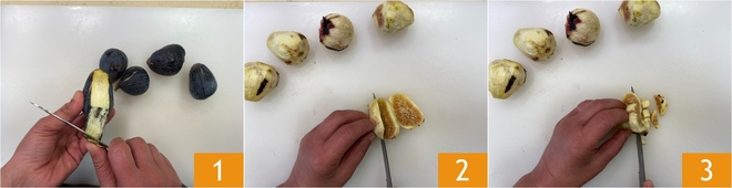 To prepare the fig and walnut semifreddo, first peel the figs 1 and then cut them into slices 2 and then into cubes 3.