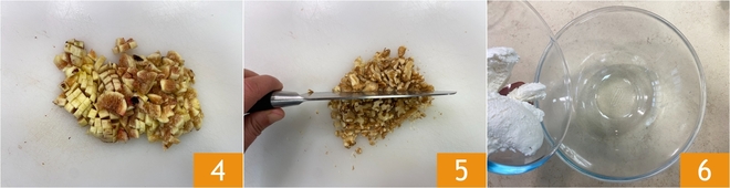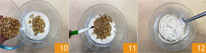 Also add the crumbled walnuts 10, the seeds you have removed from the vanilla pod 11, and mix everything with a spatula 12.