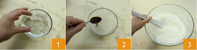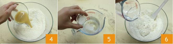 Then add the mixture 4 and dissolve the salt in the remaining portion of warm water 5, and pour this in slowly while mixing with the spoon 6.