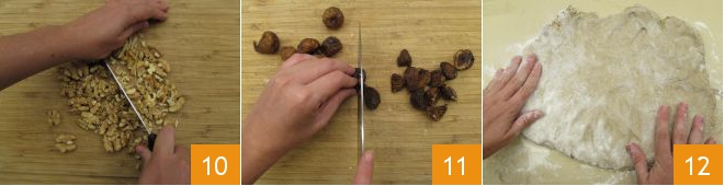 When the dough is ready, chop the walnut kernels with a knife 10 and coarsely chop the dried figs 11. On a lightly floured work surface, stretch the dough by hand to obtain a large rectangle 12.