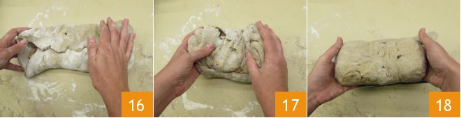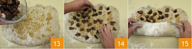 Sprinkle the nuts 13 and distribute them well with your fingers 14. Start folding the dough by lifting the edges and bringing them to the center 15.