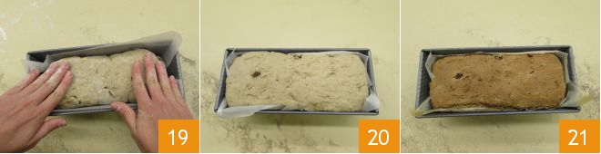 To ensure the fruit mixes into the dough, continue folding 16, repeating as many times as necessary 17. Then obtain a loaf as thick as the 10x4 inch pan lined with parchment paper 18.