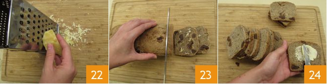 Grate the Battelmatt with a coarse grater 22. With a serrated knife, cut 8 thick slices of bread (about 0.4 inches) 23 and then butter all the slices on one side 34.