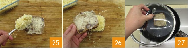 On the first slice of bread with the buttered side, add the cheese 25, then cover with another slice of bread, this time with the buttered side facing up 26. Heat a non-stick pan and brown the bread for 2 minutes covered with a lid 27,