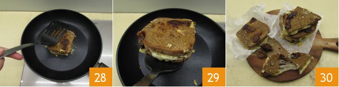 after the time, press a little and flip, then repeat the cooking for the same time 28. As soon as the first is ready 29, continue cooking all the other fig and walnut toasts with Battelmatt and enjoy them melty and hot 30.