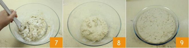 Keep mixing 7 until you obtain a homogeneous dough 8. Then cover it with plastic wrap and let it rise for an hour or until it has doubled in volume 9.
