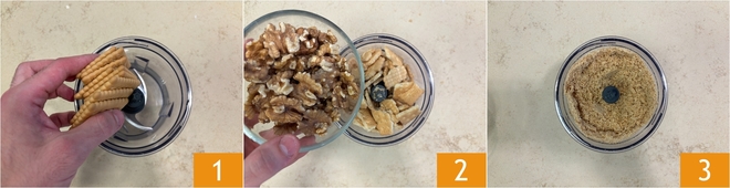 To prepare the fig cheesecake, first melt the butter and let it cool. Put the cookies 1 and walnuts 2 in a food processor and blend until you get a crumbly mixture 3.
