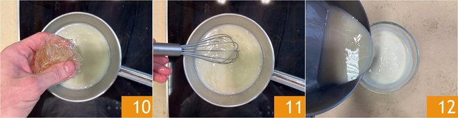 Add the well-squeezed gelatin 10 and stir to dissolve completely 11. Allow the mixture to cool slightly, then pour it into a bowl with the yogurt 12.