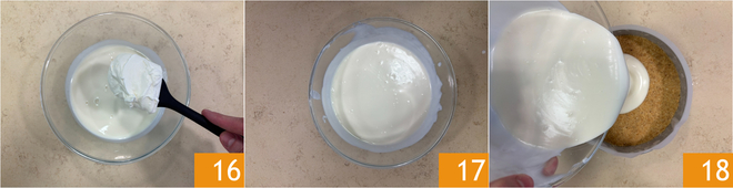 Gently fold the whipped cream into the yogurt mixture with a spatula 16, stirring gently from bottom to top to avoid deflating it 17. Retrieve the pan from the fridge and pour the cream over the base 18.