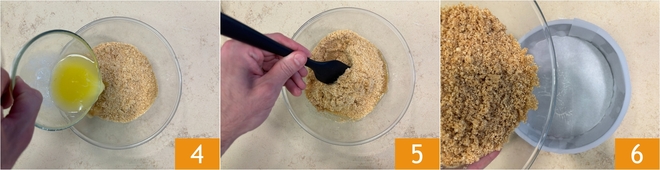 Transfer the mixture to a bowl and pour in the melted butter 4, then mix well to combine 5. Take an 8-inch springform pan, line it with parchment paper, and spread the cookie mixture on the bottom 6, pressing it down well with the back of a spoon.