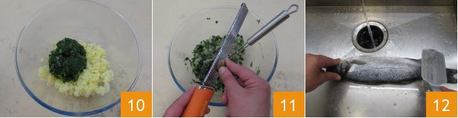combine them with the potato mixture 10, add salt and pepper, a bit of grated nutmeg 11, mix everything, and set aside the ready filling. Now focus on cleaning the sea bass: after washing it thoroughly, scale it from tail to head with a scaler 12 or a sharp knife,