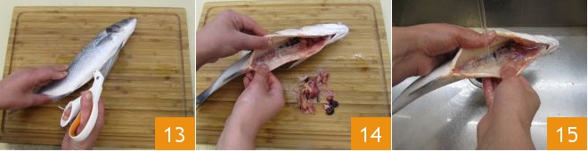 then with a pair of scissors make a cut on the belly 13 and remove the sea bass's innards 14. Rinse under running water 15 to remove residues and blood parts.