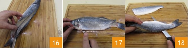 With a sharp knife, score deeply along the backbone 16, starting from the head. Remove the head 17, then separate the fillet from the backbone, turn the fish over and repeat the same operation 18.