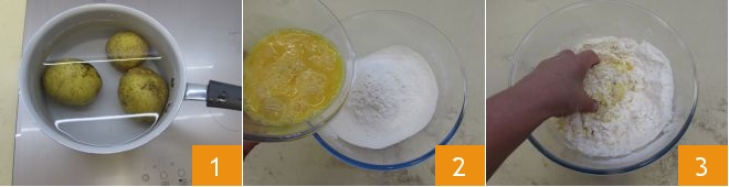 To prepare fish ravioli with cherry tomatoes, first boil the potatoes 1. While the potatoes are cooking, make the pasta: sift the flour into a bowl, and add the salt and eggs 2. Knead everything with your hands 3,