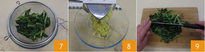 Once cooked, drain the herbs with a colander to remove their water 7, then take the potatoes, peel them and mash them with a potato masher 8. Chop the herbs with a knife 9,