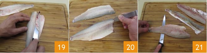 Then remove the central bone from the flesh 19 and use tweezers to remove any remaining bones 20. Finally, remove the skin from the sea bass with a very thin knife 21,
