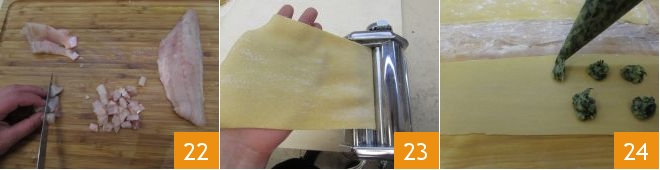 then cut it into cubes 22 and set aside. Now roll out the pasta with a pasta machine, proceeding from the smallest number to the desired thickness 23, then once rolled out, fill a piping bag with the filling and spread it gradually over the pasta 34,