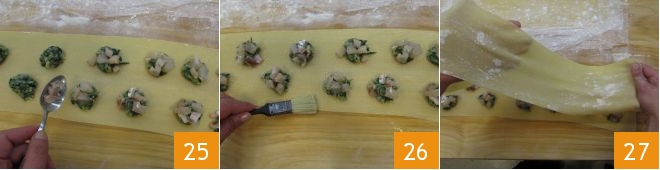 along with the sea bass cubes 25, then brush the edges of the pasta with water 26 and place another layer of pasta on top to make the ravioli 27, trying to remove the air inside.