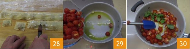 Then cut the ravioli with a wheel 28 and, once finished, place them on a tray over a kitchen towel and dust them with flour. Then focus on the sauce: wash the cherry tomatoes, cut them in half and cook them in a pan with oil and garlic 29, salt them, add the basil leaves 30, and let cook for about 10 minutes.