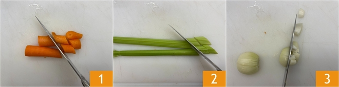 To prepare the fish stock, first of all, take the fish bones. It is best to remove the heads as they might release a too bitter taste; additionally, if you prefer a clearer stock, you can let the bones soak under running water for 30 minutes. Meanwhile, roughly chop the peeled carrot 1, the celery 2, and the previously peeled onion 3.