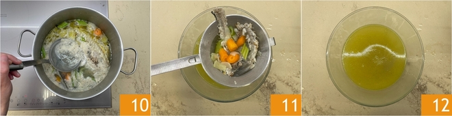 Cook for 30 minutes keeping a medium-low simmer, reducing the flame. Occasionally skim with a skimmer 10, then strain it through a fine mesh strainer 11, collecting the stock in a bowl 12. The fish stock is ready, use it for your recipes!