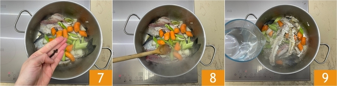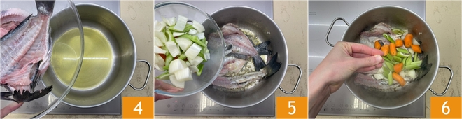 Pour a drizzle of oil into a pan; heat it over high flame and add the bones 4, then add the vegetables 5 and a pinch of salt 6.