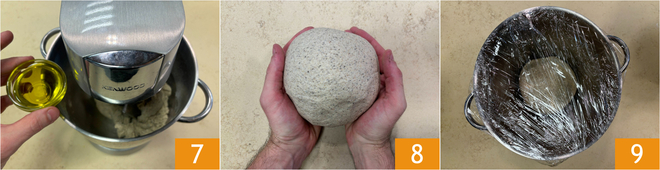 Also add the oil 7 and knead for a few minutes. Transfer the dough to a floured surface and knead for another 10 minutes until it becomes smooth and elastic. Form a dough ball 8 and place it in an oiled bowl, covered with plastic wrap 9 or a cloth. Let it rise for about 2 hours, or until doubled in volume, in a warm place.