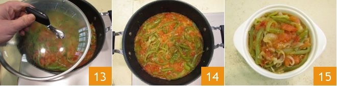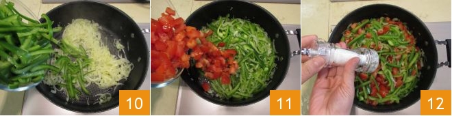 At this point, add the peppers 10 and after a minute, add the tomatoes 11. Salt to taste 12, and pepper