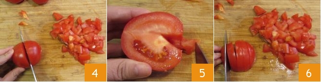 Now wash the tomatoes, cut them in half 4, remove the stem 5, and then slice them 6