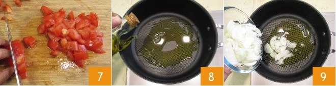 and finally cut them into cubes 7. The vegetables are ready for cooking: in a pan, heat the olive oil 8, add the sliced onions, and let them stew over moderate heat for 5-6 minutes or until soft 9.
