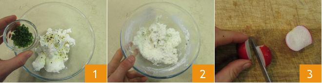 To prepare the flatbread with shrimp, zucchini flowers, and salad, first make the cream: in a bowl, pour the well-drained ricotta, the chopped chives 1, and then season with salt, oil, and pepper. Stir to flavor 2 and store in the refrigerator, covered with plastic wrap. Now wash and quarter the radishes 3.