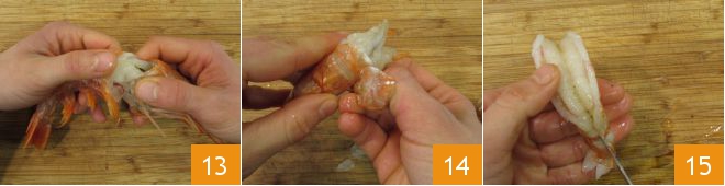 Now clean the shrimp: remove the head 13 and the shell 14, then cut the back to remove the intestinal vein 15.