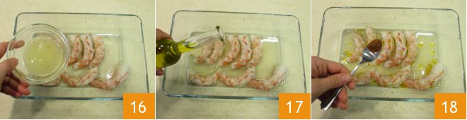 Place the cleaned shrimp in a bowl, marinate with lemon juice 16, oil 17, and paprika 18 for 20 minutes.