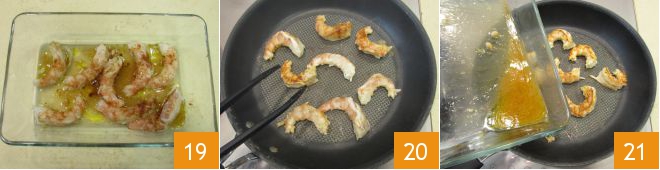 After this time, take the shrimp 19 and sear them in a hot pan for a few moments 20, pour in the marinade sauce 21.