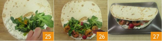 Let the liquids evaporate 22 and then keep them warm. Heat the flatbreads for a couple of minutes in a pan 23. Everything is ready for the filling, for each flatbread use 1/4 of the ingredients provided for the filling: spread the ricotta cream on half of the flatbread 34.
